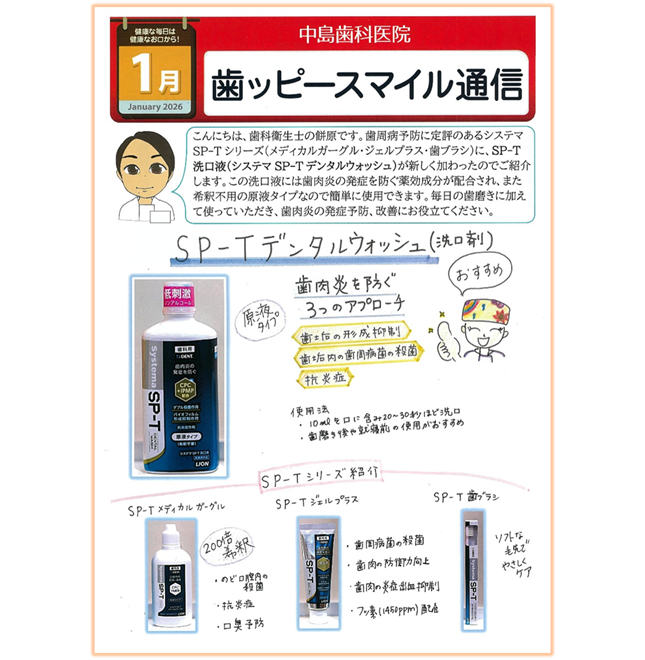 中島歯科医院 院内新聞2026年1月号は歯科衛生士の餅原が担当しました。システマSP-Tシリーズに新しく加わった、希釈せずに使えるSP-Tデンタルウオッシュ洗口剤の紹介です。先月号で紹介した歯磨剤SP-Tジェルプラスと併用し、歯周病予防に役立ててください。
